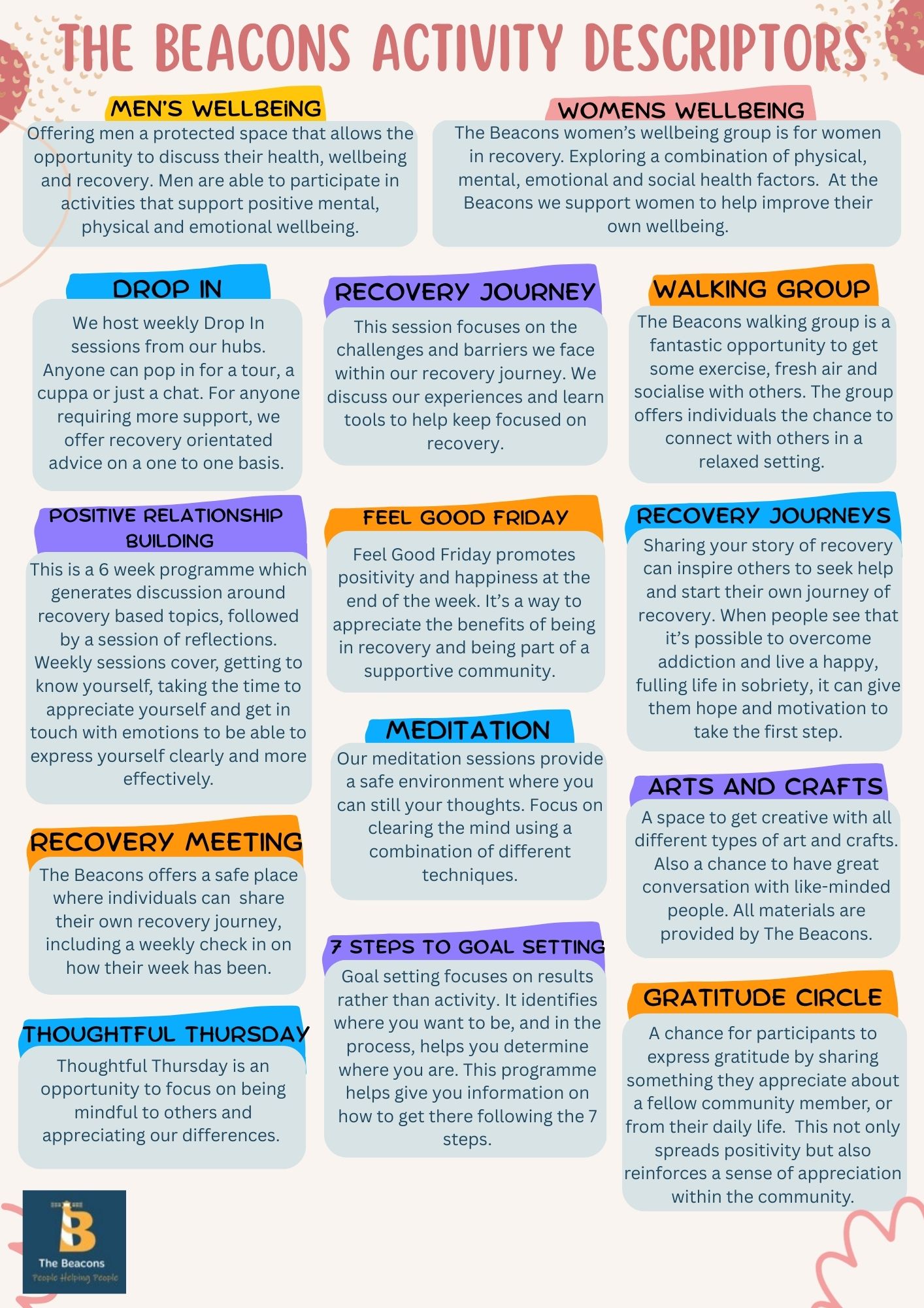 The Beacons provide a safe space for people in recovery to connect with other people with lived experience. Individuals whose needs have not been met by current service provision will find an inclusive environment where they can meet other people through a range of different activities, including: We offer a range of activities at The Beacons which we update regularly, including: