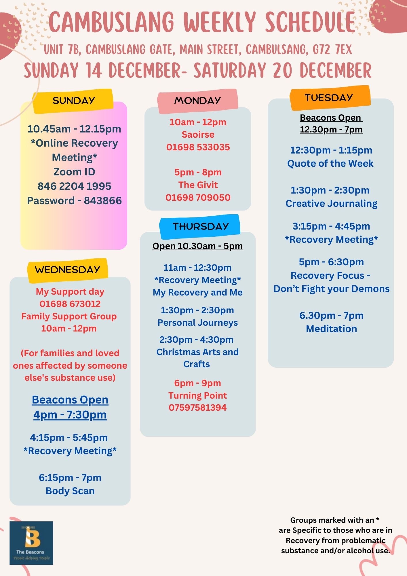 The Cambuslang Beacon is a place to feel welcome. Feel free to drop by and be a part of our recovery community - some people like come along to participate in a particular activity or event, others simply enjoy the freedom to socialise or read a book in good company and safe surroundings. You can keep updated about what's on each week at the Cambuslang Beacon below.