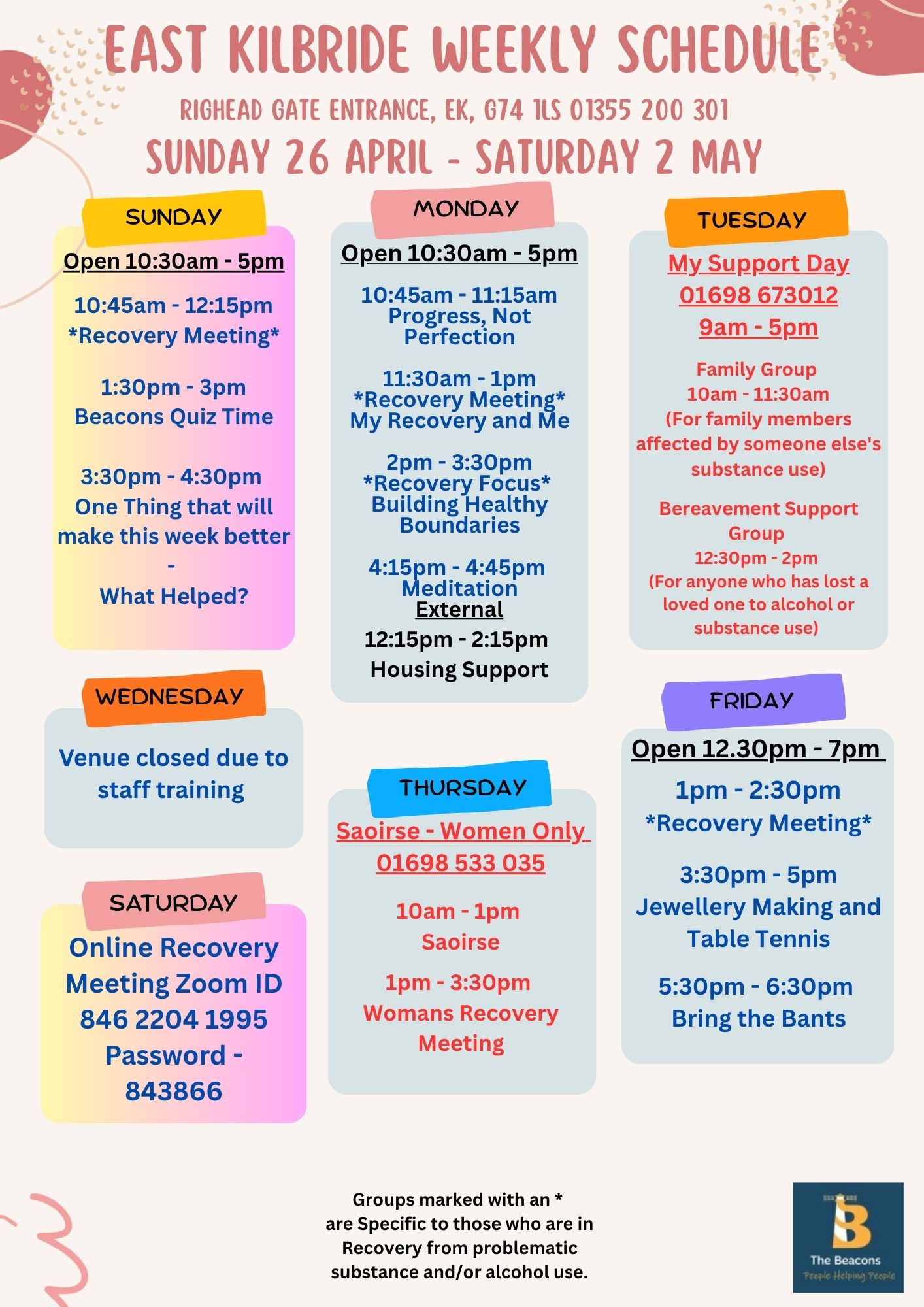 Welcome to the East Kilbride Beacon page! This is a friendly space where our members are in the driving seat, deciding what activities go on here and when it's just relaxing time. You can keep updated about what's on here and always feel free to pop down and join in or chill as the mood takes you. Some people like things to do, other like the freedom to simply socialise or read a book in good company with safe surroundings. We are here for our members to do as they please.