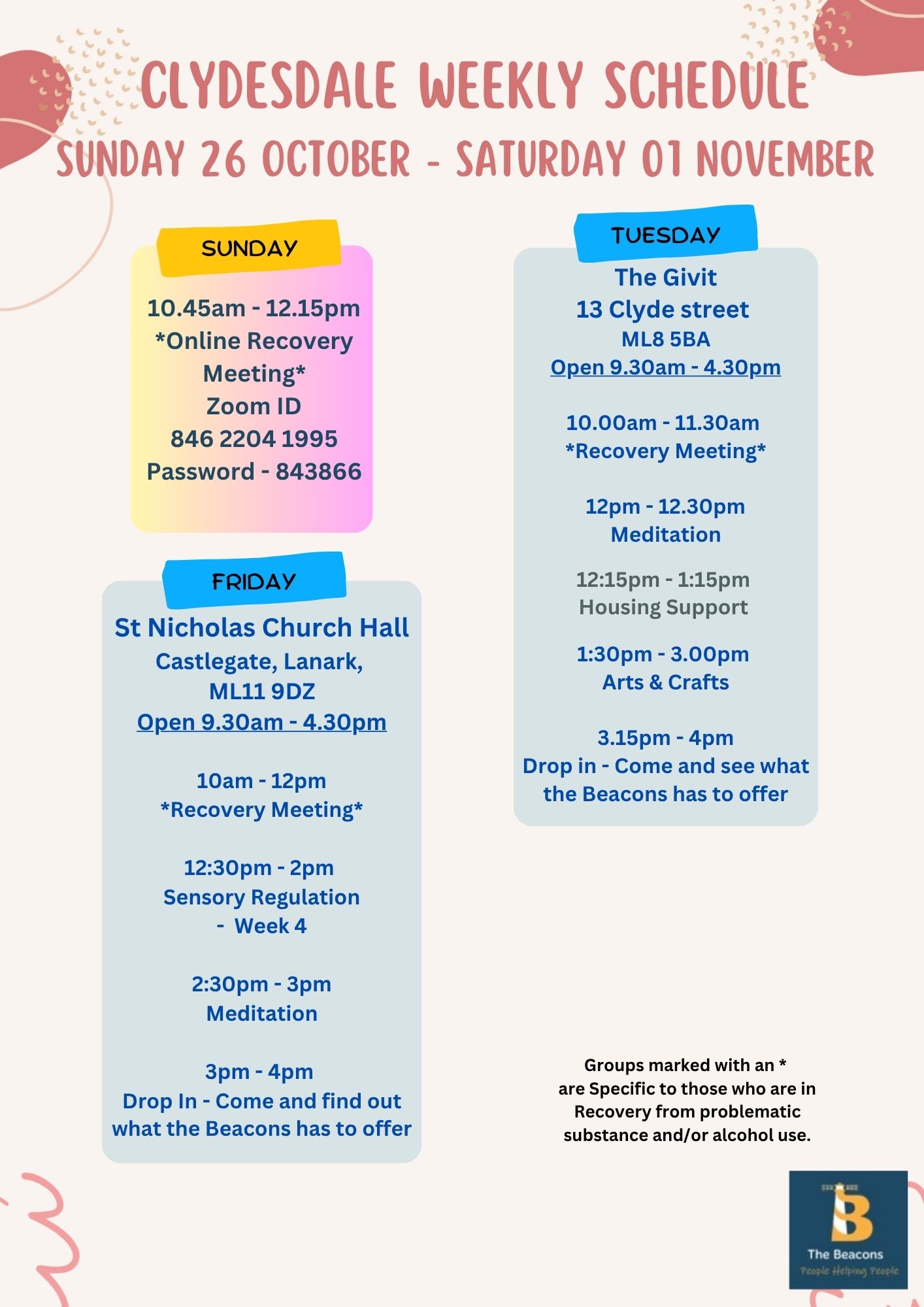 The activities and opportunities delivered by The Beacons in the Clydsdale are delivered in a range of venues and towns. We appreciate Clydsdale is a large area and transport options can be limited for some people. To try to address this we are no longer a single venues in Lanark main Street but rather, we provide our activities in various towns.
