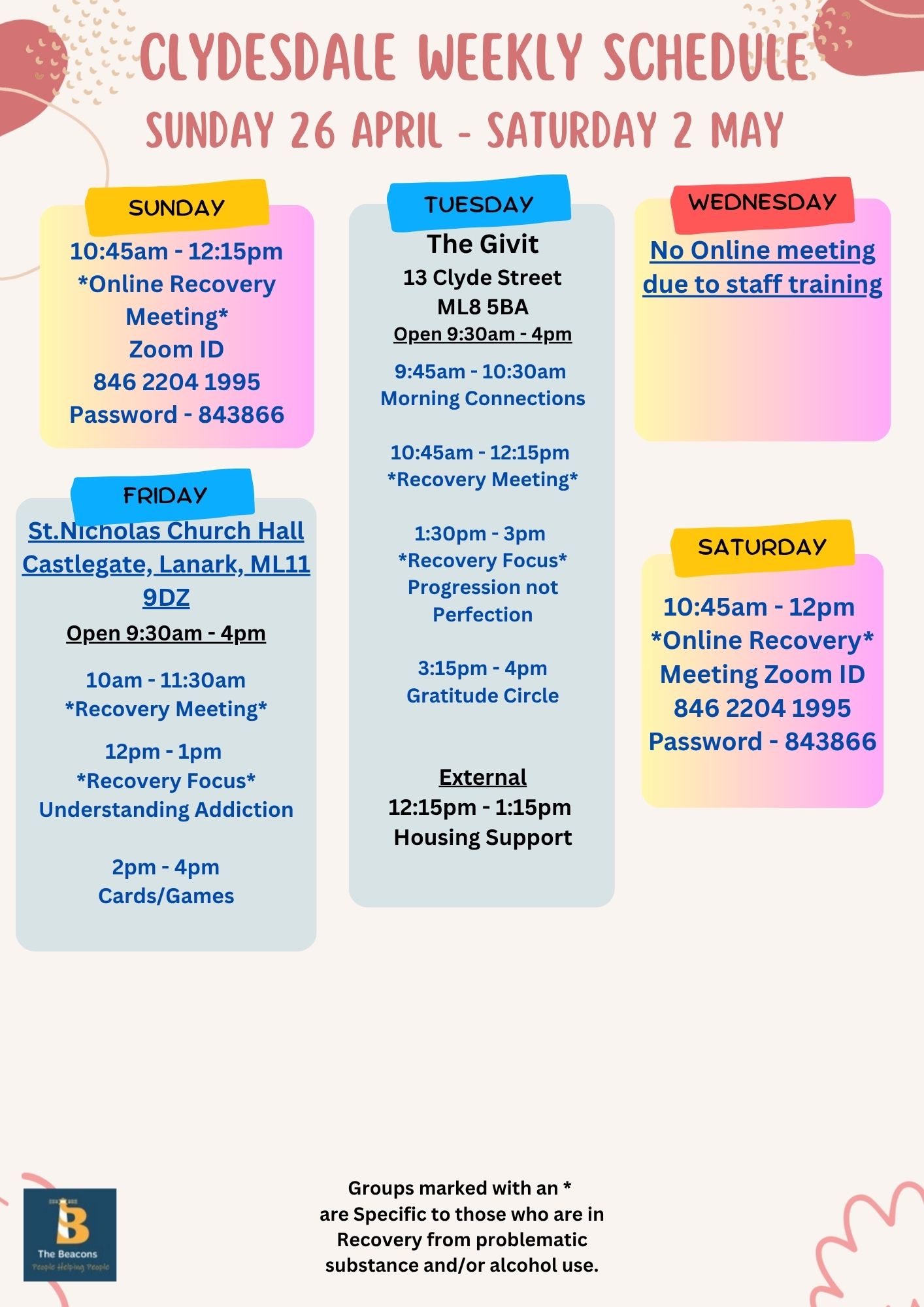 The activities and opportunities delivered by The Beacons in Clydsdale are delivered in a range of venues and towns. We appreciate Clydsdale is a large area and transport options can be limited for some people. To try to address this we are no longer in a single venue in Lanark main Street but rather, we provide our activities in various towns.